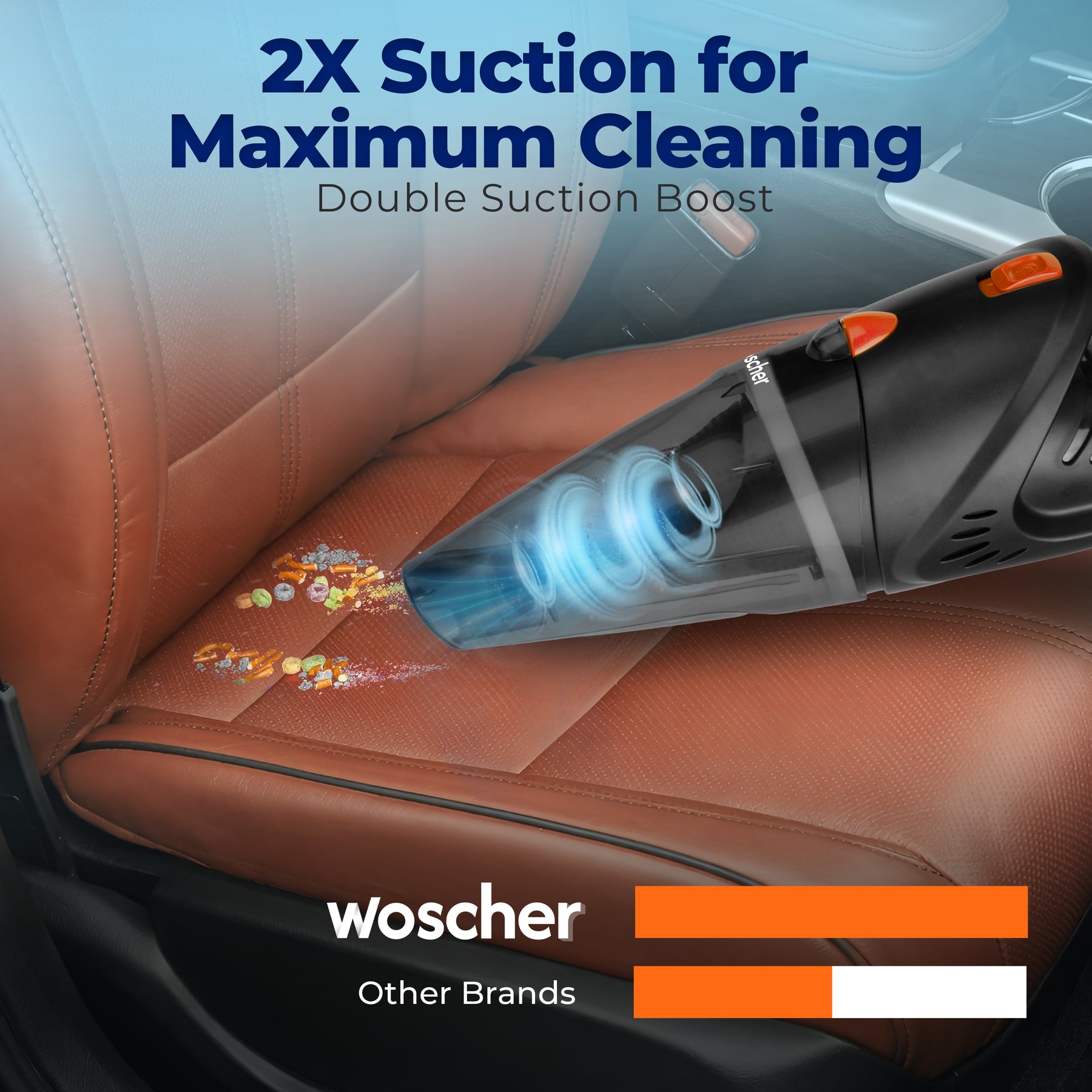 A Woscher vacuum cleaner for car is a device used to clean up dirt and dust from floors, carpets, furniture, and other surfaces. Batteries or electricity can be used to power it. In most car cleaning vacuum, suction pulls dust and other particles into a bag or other container so they can be thrown away. Vacuum cleaners come in different shapes and sizes, depending on the application they are intended for. For instance, car cleaning vacuum have special attachments that help them get into tight spaces and remove dirt from hard-to-reach places.
