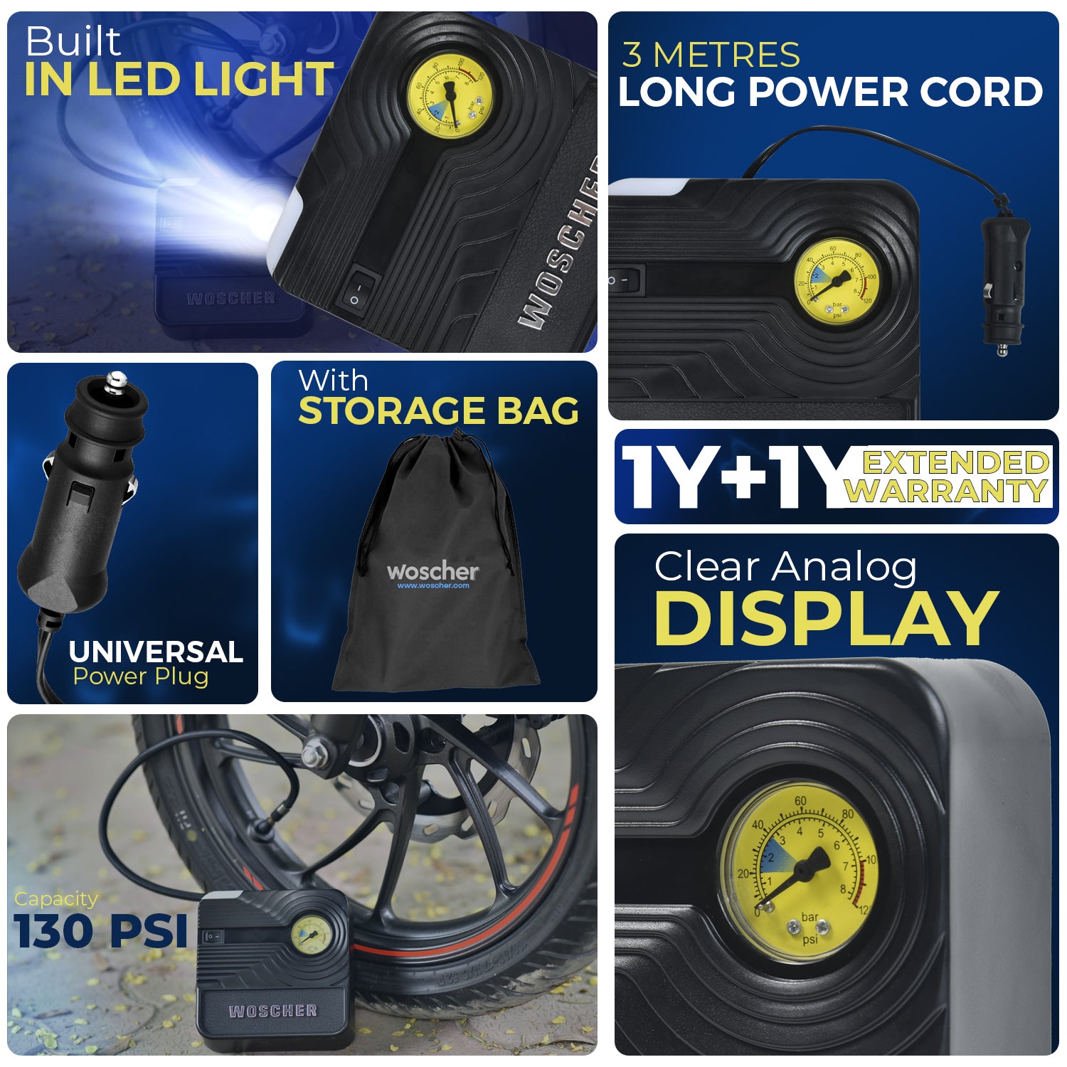 The Woscher rapid-performance portable tyre inflator is essential for all motorists. It allows you to quickly and easily inflate your tyres in minutes, meaning you don’t have to wait around for a mechanic or tyre shop. It also means that you can get back on the road much faster if you have a flat tyre.