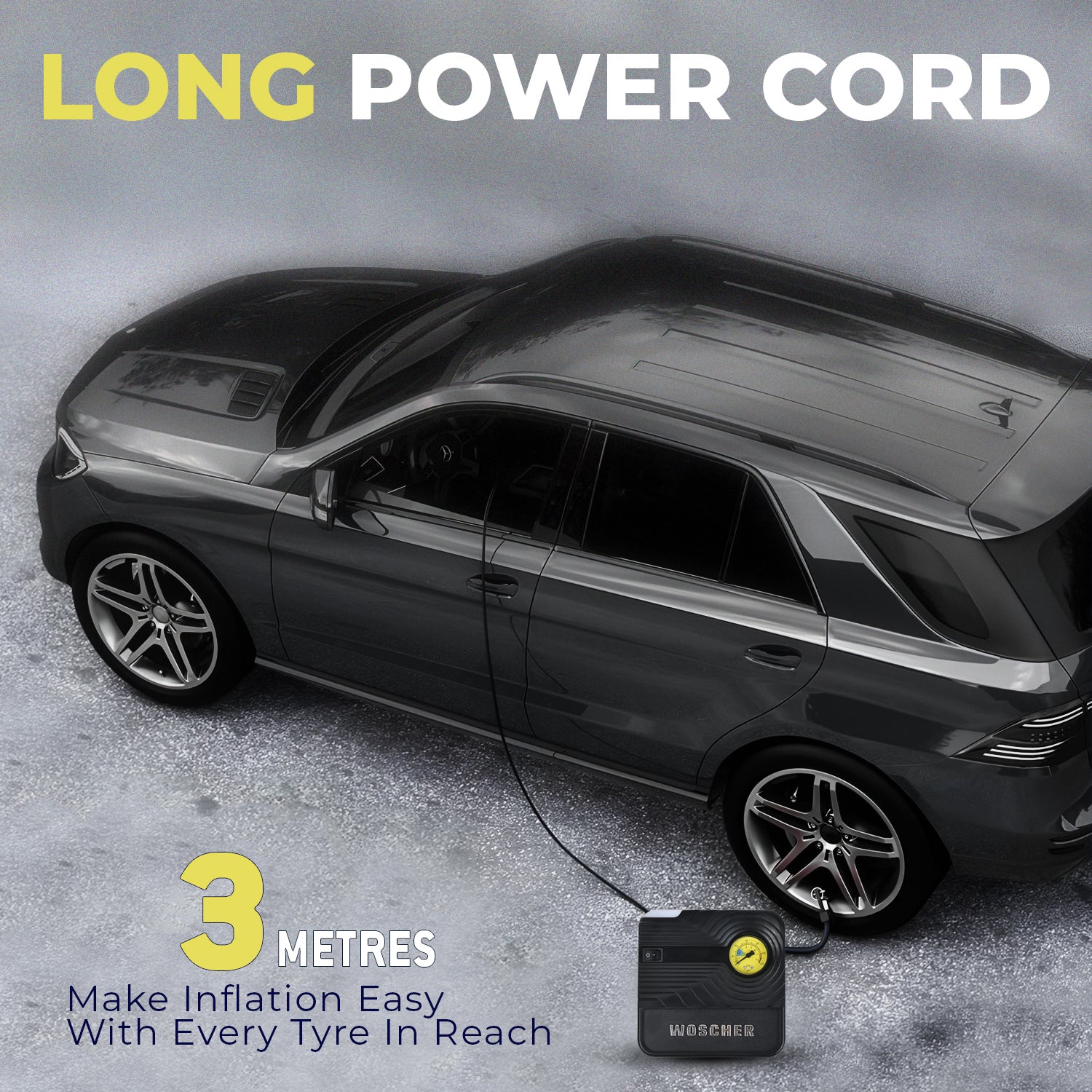 The Woscher rapid performance portable tyre inflator has the power cable of the tyre inflate measuring 3 metres (12 feet) in length, and it has been built so that you can reach any of the four wheels and even beyond.