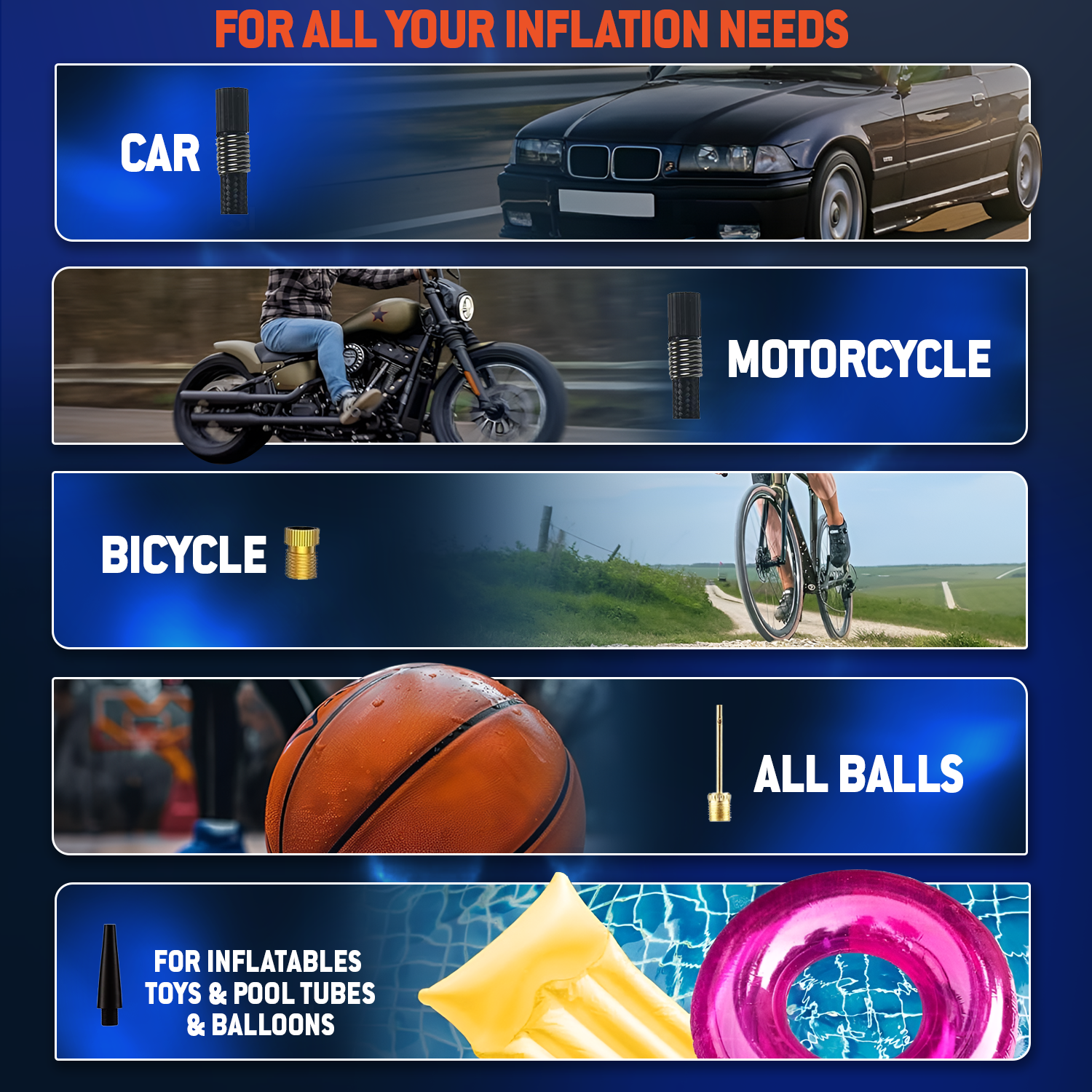 The air pump's wide range of applications makes it an even better value. It has two high-flow nozzles and adapters, making it easy to use on various tires without having to look for an external power supply.